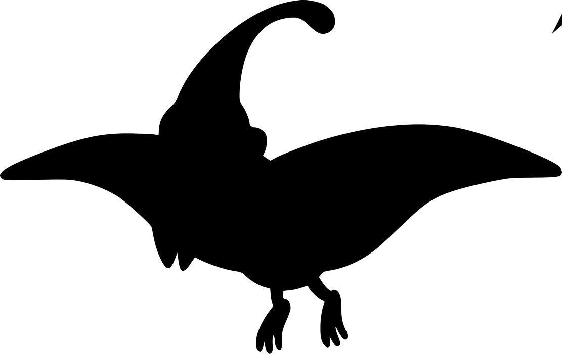 This image displays a stark black silhouette of a Pteranodon against a pure white background. The prehistoric flying reptile is depicted in a dynamic, mid-flight pose, showcasing its expansive, bat-like wings. Its most prominent feature is the long, backward-curving cranial crest, characteristic of the Pteranodon, along with its slender body and two small, clawed feet visible beneath. The clean lines and solid fill create a striking, easily recognizable form.