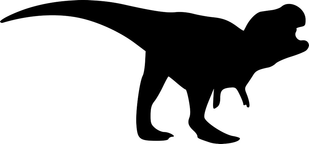 This image displays a striking black silhouette of a Tyrannosaurus Rex in a dynamic, walking or roaring pose. The profile view highlights its massive head with an open mouth, powerful hind legs, and a long, thick tail extending backward for balance. The characteristic small forelimbs are also visible, contributing to the recognizable form of this iconic predatory dinosaur.