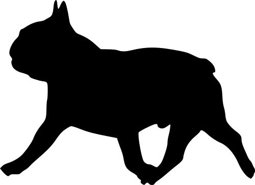 This image displays a black silhouette of a French Bulldog in a dynamic running or trotting pose, viewed from its left side. The dog exhibits its characteristic short, erect 'bat' ears, a compact, muscular body, and a short, curled tail. Its legs are extended to convey motion, with the front left leg reaching forward and the rear left leg pushing back, creating a sense of energetic movement. The overall shape is clean and well-defined against the white background.