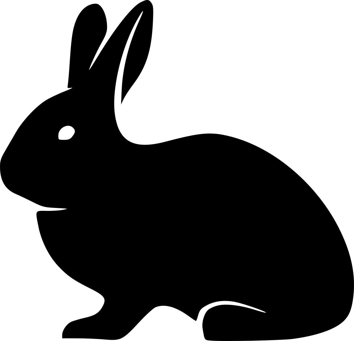 This image displays a minimalist black silhouette of a rabbit in a sitting or resting posture, viewed from its left side. The rabbit has long, upright ears and a rounded body shape. A small, distinct white oval represents its eye, providing a subtle contrast against the solid black form. The overall style is clean and graphic, emphasizing the characteristic contours of the animal.