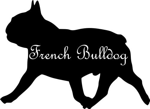 This image displays a black silhouette of a French Bulldog in a dynamic, running or trotting pose. The dog's characteristic bat-like ears and compact, muscular body are clearly depicted. Overlaid in white, elegant script font, the words 'French Bulldog' are prominently featured across the dog's body, making the breed instantly identifiable. The overall style is clean and graphic, emphasizing the distinct shape of the French Bulldog.