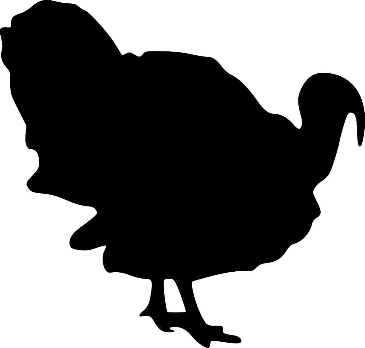 This design features a striking black silhouette of a turkey in a side profile, standing with its head slightly raised. The outline captures the bird's characteristic plump body, distinct wattle and snood on its head, and two visible legs with feet. The overall style is clean and well-defined, emphasizing the recognizable form of a domestic turkey.