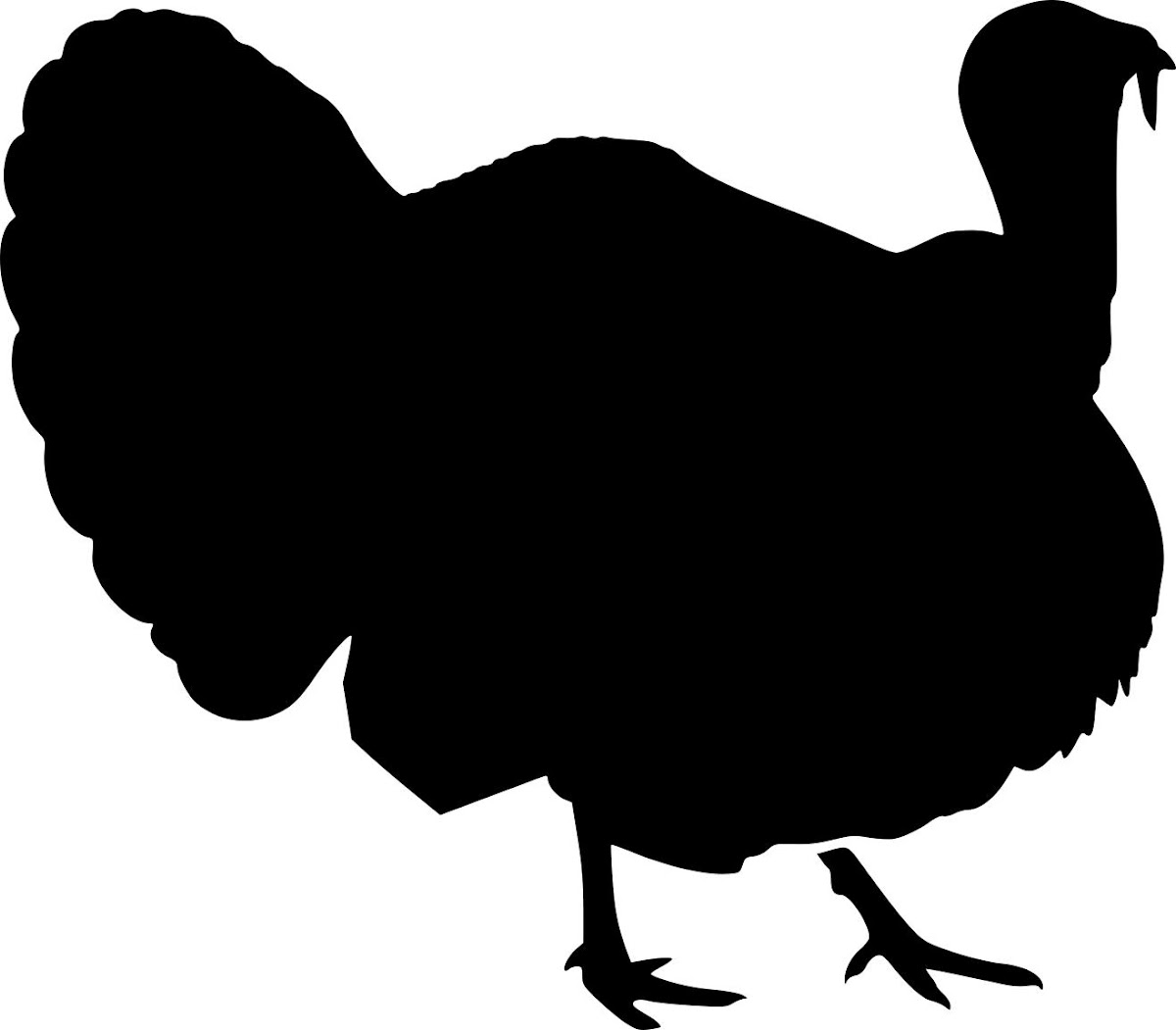 This image displays a detailed black silhouette of a turkey in a side profile, facing right. The prominent fanned tail feathers are clearly visible, along with its large, rounded body. The turkey's distinctive head features a visible snood (the fleshy appendage hanging over the beak), and two slender legs with three-toed feet are shown at the bottom, indicating a walking or standing posture.