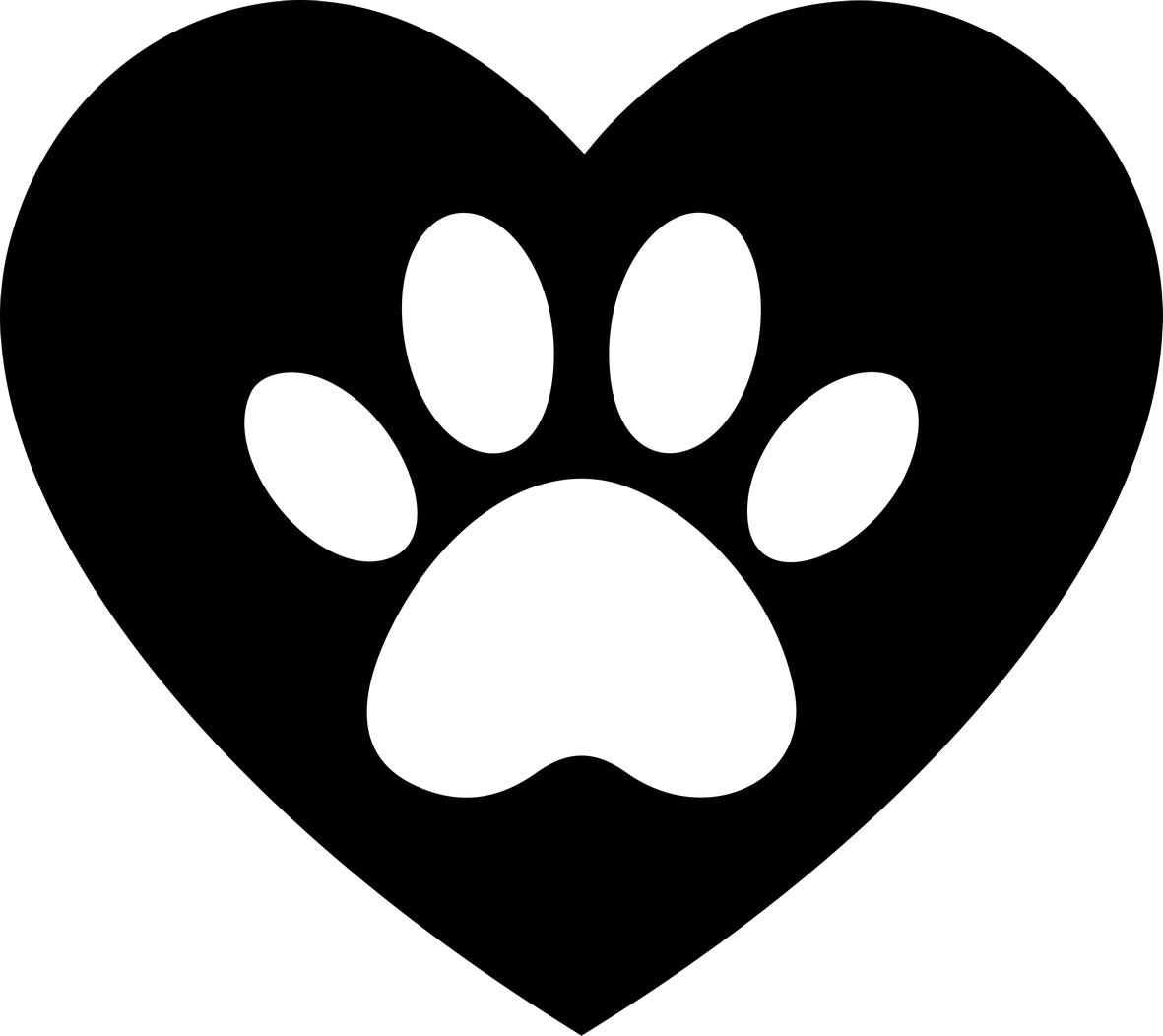 The image displays a bold black heart shape, centrally featuring a crisp white paw print. The paw print consists of one large, rounded pad at the bottom and four smaller, oval-shaped pads arranged in an arc above it. The overall style is a clean, minimalist silhouette, creating a strong contrast between the black heart and the white internal shape.