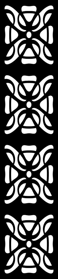 The image displays a vertical panel composed of four identical, stacked abstract geometric motifs in white against a solid black background. Each individual motif is highly symmetrical, featuring a central vertical oval element from which four curved, somewhat triangular shapes extend outwards. These are further surrounded by four larger, rounded, teardrop-like elements positioned diagonally, and four semi-circular arcs on the cardinal directions, creating a complex, interconnected design. The overall style is clean, graphic, and highly stylized, resembling a modern decorative architectural element or a repeating textile pattern.
